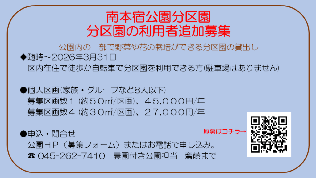 始めての方でも、栽培相談員や貸し出し用具などもありますので、気軽に始められます。